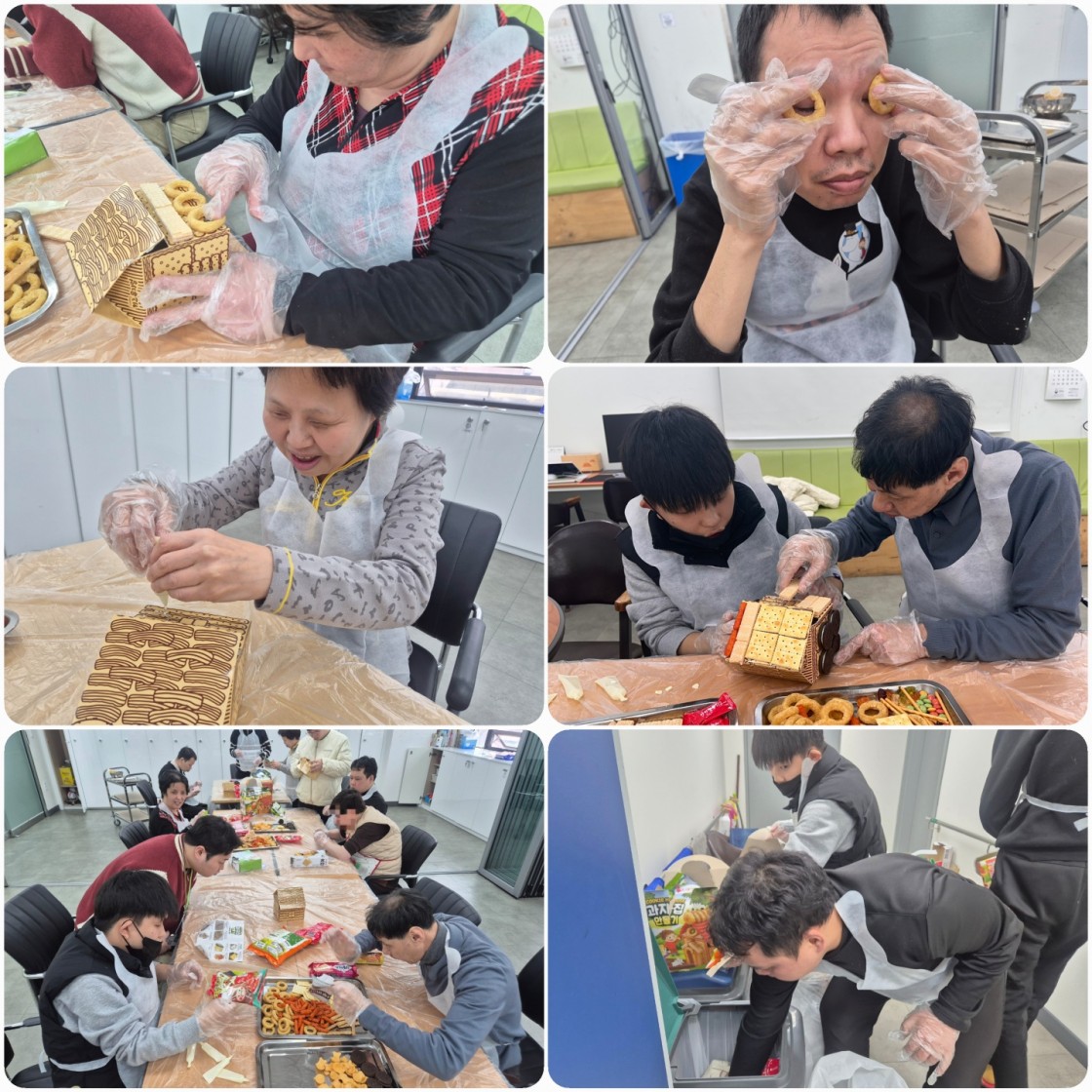 요리 활동이 진행되는 당일에는 헨젤과 그레텔 영상을 보며 과자집에 관한 이야기 나누기 시간도 있었습니다. 다양한 과자와 초콜렛 등을 자유롭게 섭취하며 과자집을 만들어 이용인 들이 흥미롭게 참여가 가능하였습니다.
