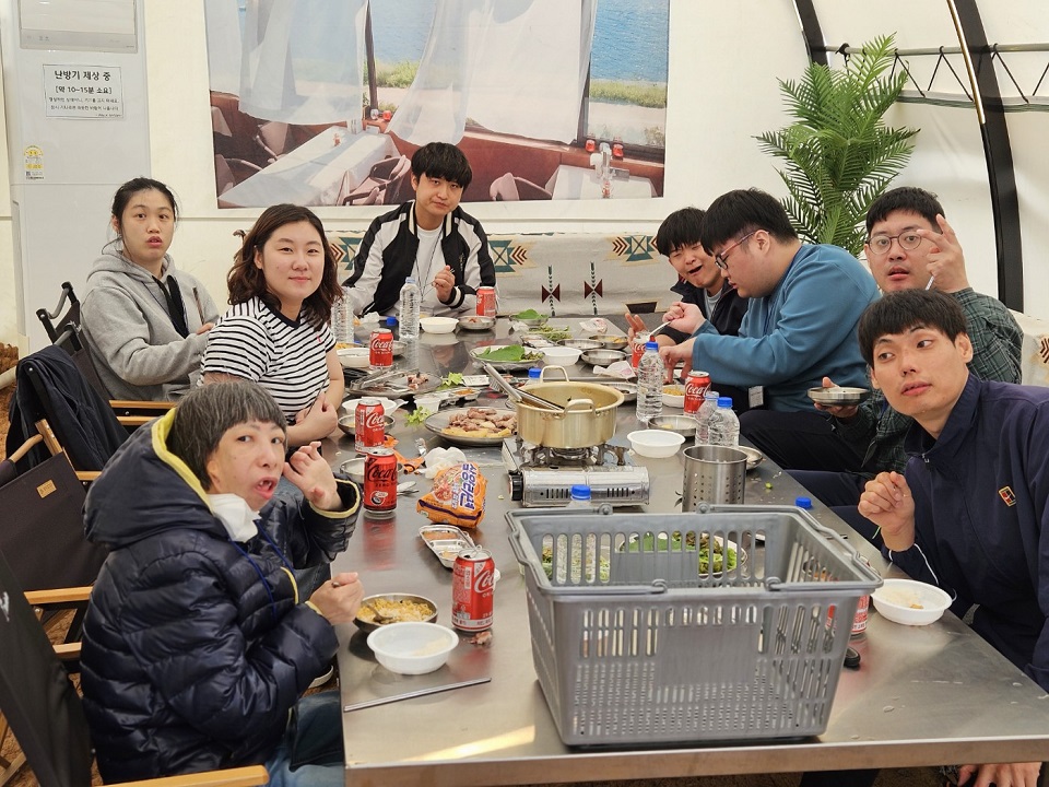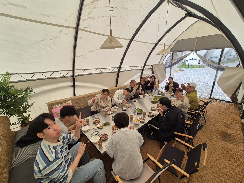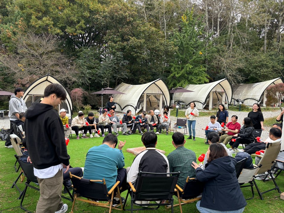 캠핑장에 도착하여 아름다운 자연풍경을 즐기고 점심식사로 바비큐그릴에 돼지고기와 다양한 야채를 구워먹었습니다. 고기와 함께 밥과 라면도 먹으며 즐거운 점심시간 후 가을 분위기가 물씬 풍기는 포토존에서 사진도 찍고, 뽑기기계에서 간식도 뽑아 먹으며 휴식을 누렸습니다. 오후에는 레크레이션으로 서로의 노래실력을 뽐내기도 하고 뿅망치 게임을 하며 즐거운 시간을 보냈습니다.