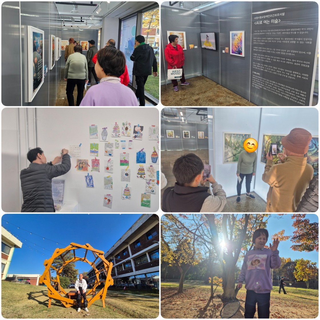 AI활용 장애예술 활동지원 성과공유전시인 ‘YOU&I 당신과 나의 인사로 발달장애인들이 컴퓨터를 이용해서 그림과 시를 전시한 전시회였습니다. 전시를 보며 서로 사진 촬영도 해주며 이용인들 간의 친밀도가 향상되는 시간이였습니다.