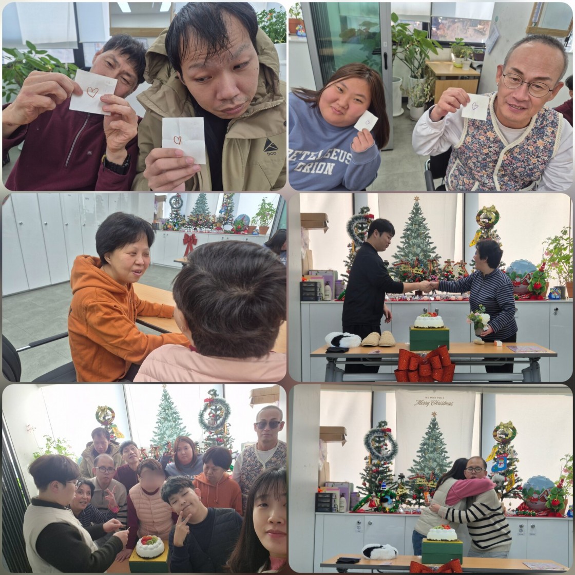3회기는 선물 교환식, 새해 소원 빌기, 25년도 영상 시청을 하며 한 해를 마무리하는 시간을 가졌습니다. 제비뽑기로 동료와 짝을 이루고 짝이 좋아하는 음식, 취미, 받고 싶은 선물에 관하여 소통하였습니다. 인근 상점에 방문하여 서로 받고 싶은 선물을 구매하고 1회기에 만든 포토존에서 선물 증정식이 있었습니다. 이후에는 한해의 영상을 시청하여 25년도의 다양한 활동들을 추억하였습니다. 마지막으로 케이크에 초를 붙이고 다가오는 새해의 소원을 다함께 빌며 한해를 마무리하였습니다.