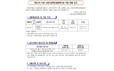 공고 2025-60호사회복지법인 수원중앙복지재단 수원시광교장애인주간보호시설 직원 채용 모집 공고 사회복지법인 수원중앙복지재단이 수탁 운영하는 수…