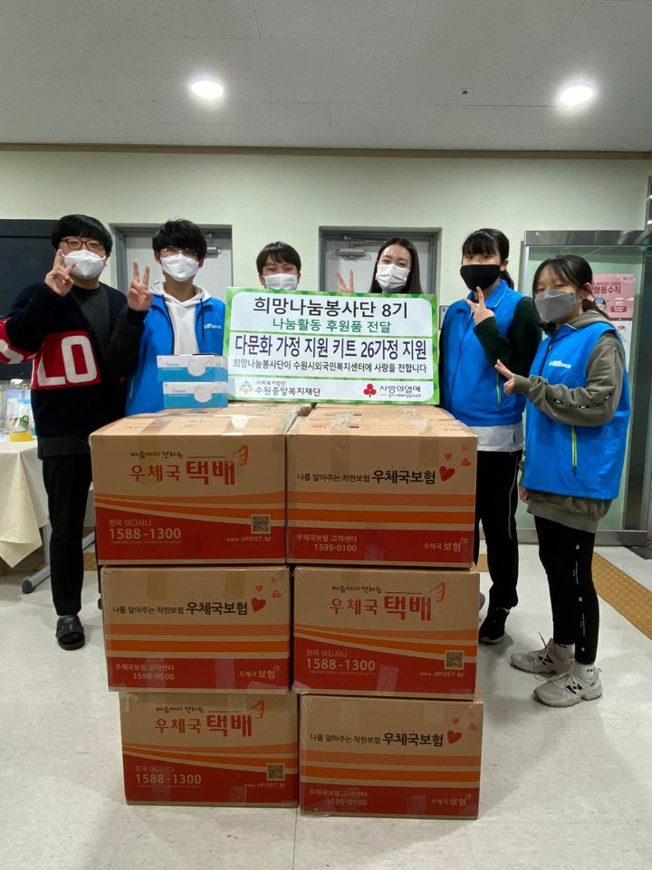 2020년 10월 17일(토) 수원중앙복지재단 2020년 희망나눔봉사단 8기와 함께하는 다문화가정 키트지원 프로그램을 진행하였다.