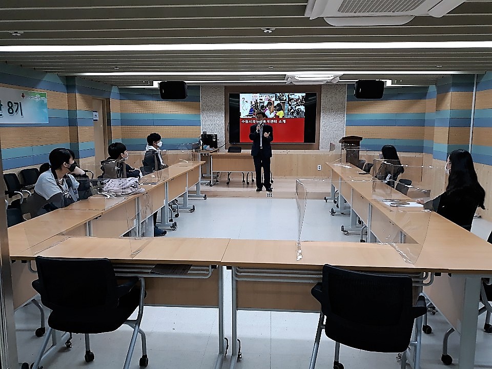 키트 제작에 앞서 수원시외국인복지센터 이종순 센터장으로부터 다문화와 외국인에 대한 인식개선교육 및 주요 사업에 대해 설명을 듣는 시간을 가졌다,