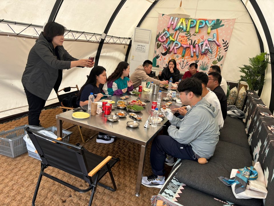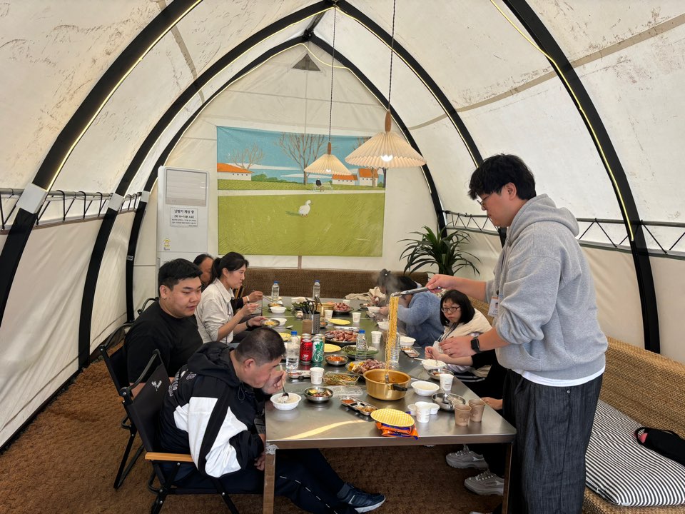 캠핑장에 도착하여 아름다운 자연풍경을 즐기고 점심식사로 바비큐그릴에 돼지고기와 다양한 야채를 구워먹었습니다. 고기와 함께 밥과 라면도 먹으며 즐거운 점심시간 후 가을 분위기가 물씬 풍기는 포토존에서 사진도 찍고, 뽑기기계에서 간식도 뽑아 먹으며 휴식을 누렸습니다. 오후에는 레크레이션으로 서로의 노래실력을 뽐내기도 하고 뿅망치 게임을 하며 즐거운 시간을 보냈습니다.