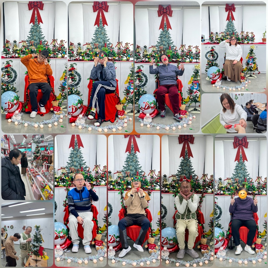 1회기 트리꾸미기 시간에는 경제활동과 연계된 활동이 진행되었습니다. 12월 경제활동의 주제가 ‘크리스마스’로 본인, 공간, 선물로 분류하여 크리스마스와 관련된 물품을 구매하는 시간을 가졌습니다. 경제활동에서 구매한 물품으로 공간을 꾸미고 아이템을 장착하며 크리스마스 분위기를 연출했습니다. 또한 송년행사에서도 트리를 꾸며줄 물품을 구매하고 이용인들이 직접 포토존을 꾸미고 사진 촬영을 했습니다.