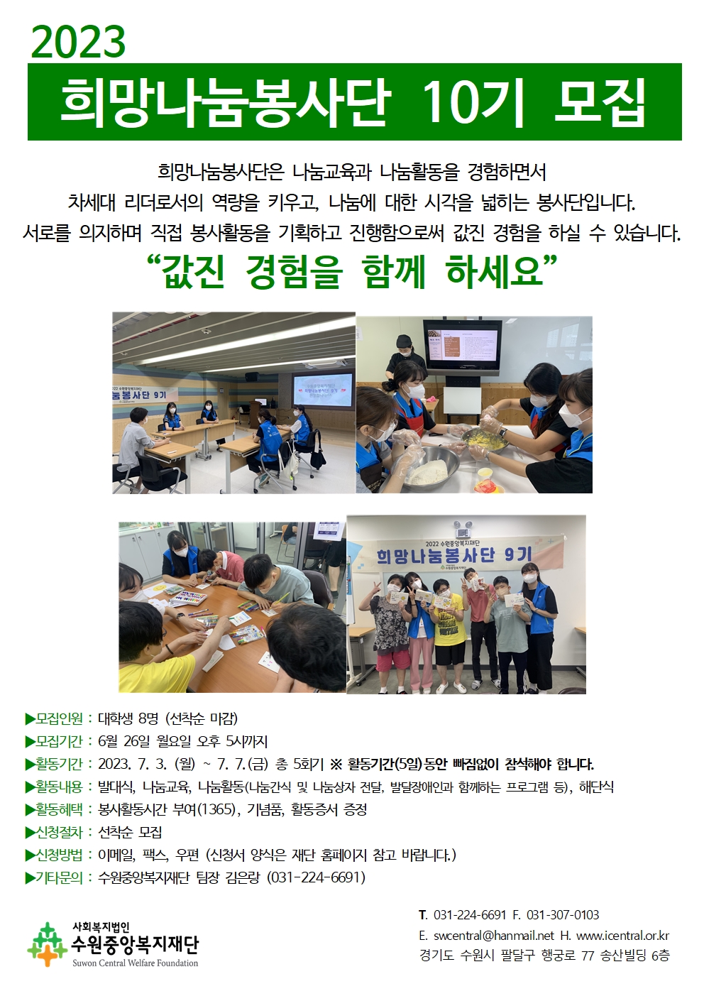 수원중앙복지재단 희망나눔봉사단 10기 모집에 많은 관심과 참여 부탁드립니다.